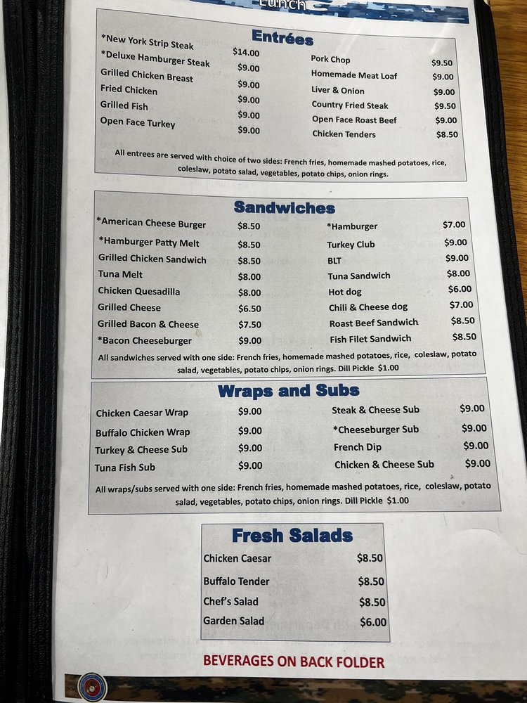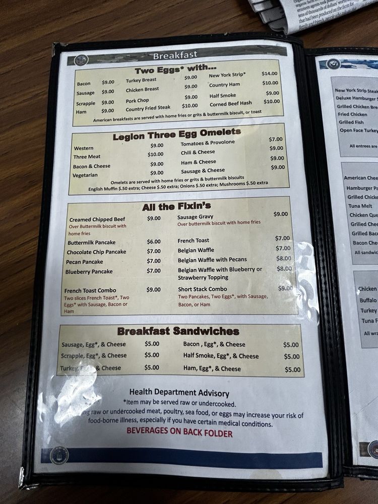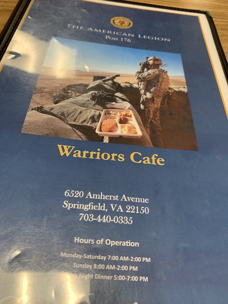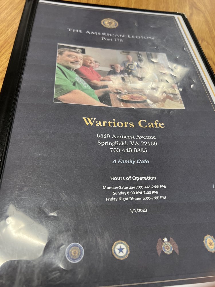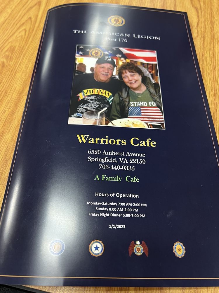 Introducing the menu at Warrior Cafe Post 176, a hidden gem in Springfield, VA. This cozy diner offers a variety of breakfast dishes ranging from classic 2 eggs with bacon or sausage to indulgent creamed chipped beef over a buttermilk biscuit. The Legion 3 Egg Omelets are a must-try, with options like the hearty 3 Meat or flavorful Western. The ambiance may be simple, but the food speaks volumes with its homestyle flavors and generous portions. Customers rave about the affordability and deliciousness of the breakfast fare. With friendly service, ample parking, and a laid-back atmosphere, Warrior Cafe Post 176 is the ideal spot for a satisfying breakfast or brunch experience.